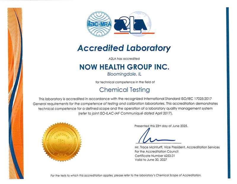 NOW®, the largest independent and family-owned manufacturer of natural products, is proud to announce that NOW’s in-house laboratories have successfully expanded the scope of its ISO 17025 accreditation by the American Association for Laboratory Accreditation(A2LA)in both the chemical and biological fields. The accreditation process involved a thorough assessment and review of the lab’s quality management system and competence.