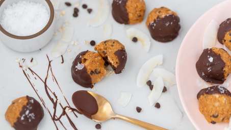 Chocolate-Dipped Caramel Peanut Butter Oat Bites