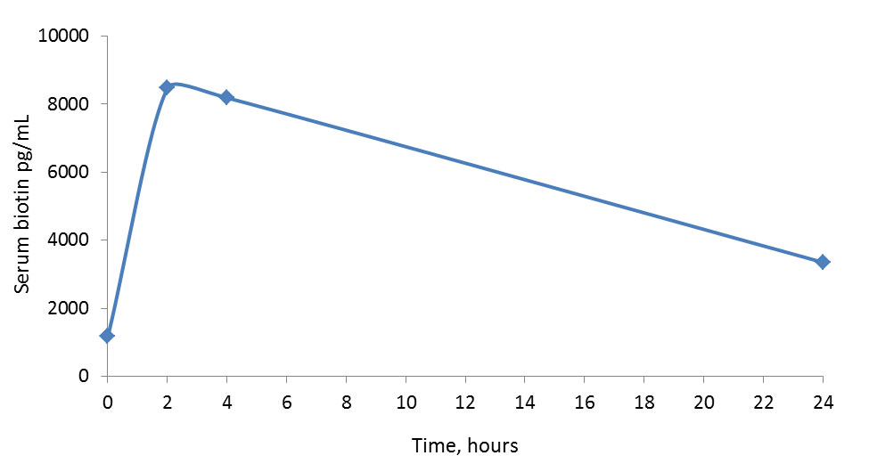 Average serum biotin levels before, and 2, 4 and 24 hours following a single administration of one capsule of Biotin 5,000 mcg (NOW® Foods, Bloomingdale, IL; Product #0471) in healthy adult volunteers.