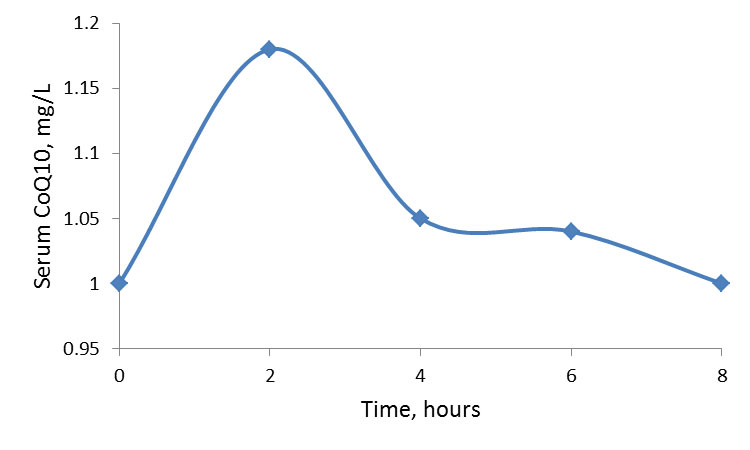 | Time, hours | Serum CoQ10, mg/L | 0 | 1 | 2 | 1.18 | 4 | 1.05 | 6 | 1.04 | 8 | 1 |