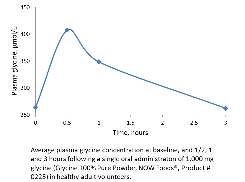 Glycine is a non-essential amino acid that acts as a precursor of creatine and supports glycogen storage.* Three healthy adult volunteers 22 to 55 years old participated in a clinical trial to study the bioavailability of glycine, a dietary supplement from NOW® (item # 0225). Plasma glycine was measured at baseline, and 30 minutes, 1 and 3 hours following oral administration of 1 g of glycine powder.