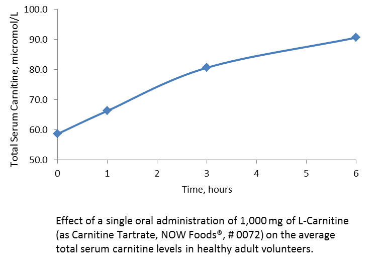 Three healthy adult volunteers, 22 to 55 years old, participated in a clinical trial to study the bioavailability of L-Carnitine 500 mg, a dietary supplement from NOW® (# 0072). Total serum carnitine was measured at baseline, and again at 1, 3, and 6 hours following oral administration of 2 capsules providing 1 gram of L-Carnitine from carnitine tartrate.