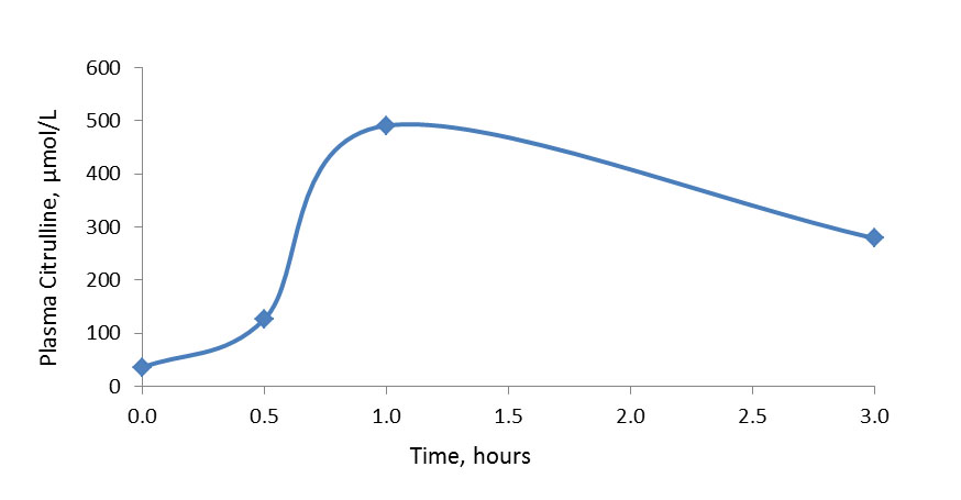 Three healthy adult volunteers 22 to 55 years old participated in a clinical trial to study the bioavailability of L-Citrulline, a dietary supplement from NOW® (#0103). Plasma L-citrulline was measured at baseline, and 30 minutes, 1 hour, and 3 hours following oral administration of 4 capsules providing 3 grams (3,000 mg) of L-citrulline.