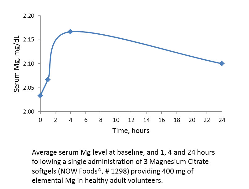 Magnesium Citrate Softgels provide magnesium in three forms (citrate, glycinate, and malate). Magnesium is a mineral involved in metabolism, muscle contraction, nerve impulse transmission, and bone mineralization.* Three healthy adult volunteers 26 to 59 years old participated in a clinical trial to study the bioavailability of Magnesium Citrate Softgels, a dietary supplement from NOW® (item # 1290). Serum magnesium concentration was measured at baseline, and at 1, 4, and 24 hours following oral administration of three Magnesium Citrate Softgels, providing 400 mg elemental magnesium.