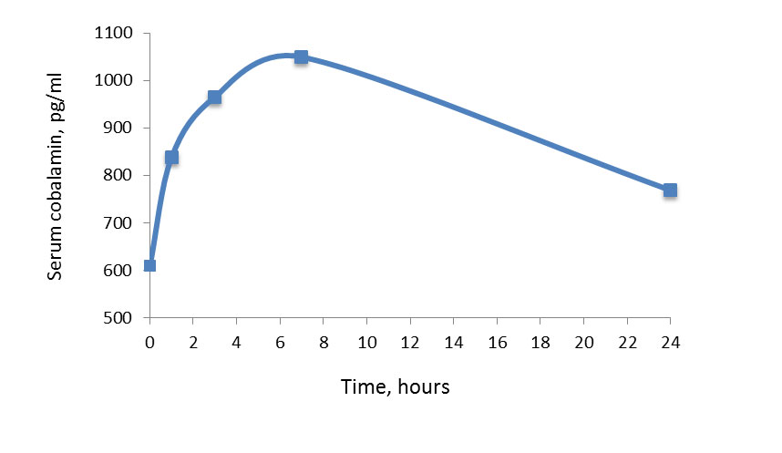 Average cobalamin level was increased one hour after administration, and peaked seven hours following administration, reaching 54% above the baseline level. Average cobalamin concentration remained 17% above the baseline level 24 hours post-supplementation. This study confirms the exceptional bioavailability of NOW® Methyl B-12.