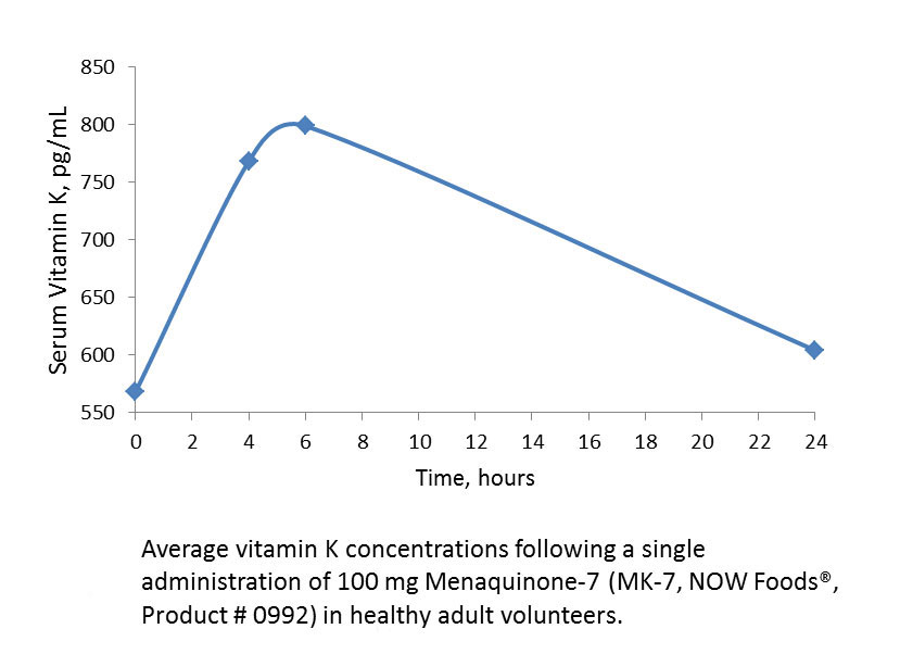 MK-7 is a form of vitamin K-2 that plays a role in the synthesis of blood coagulation factors, bone health, and the maintenance of vascular elasticity.* Three healthy adult volunteers 28 to 52 years old participated in a clinical trial to study the bioavailability of MK-7, a dietary supplement from NOW® (item # 0992). Plasma vitamin K was measured at baseline, and again at 4, 6 and 24 hours following oral administration of one capsule providing 100 mcg of NOW® MK-7.