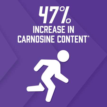 Results: Beta alanine significantly increased carnosine content in the calf muscle by 47% in one section and by 37% in another section compared to the baseline.* In placebo the carnosine content in the calf muscle was either unchanged or increased to a less degree than the effect of beta alanine in the calf muscle compared to baseline.* Significant improvements were also seen in dynamic knee extension torque when comparing pre/post data.*4