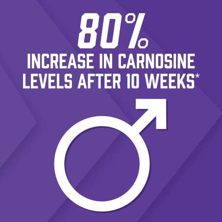 Results: Beta alanine supplementation significantly increased muscle carnosine level by 58.8% after 4 weeks and by 80.1% after 10 weeks compared to baseline.* Carnosine levels Increased equally in type 1 and 2 muscle fibers compared to no increase in placebo.* Beta alanine supplementation also increased total work done by 13% after 4 weeks and by 16.2% after 10 weeks compared to baseline.* No change occurred in the placebo group.*5