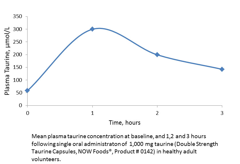 Taurine is a conditionally essential amino acid that functions by stabilizing cell membranes, aiding the transport of electrolytes, and helping to generate and regulate nerve impulses.* Three healthy adult volunteers aged 30 to 51 years participated in a clinical trial to study the bioavailability of Taurine 1000 mg, a dietary supplement from NOW® (item # 0142). Plasma taurine was measured at baseline, and again at 1, 2 and 3 hours following oral administration of one capsule providing 1 gram of taurine.
