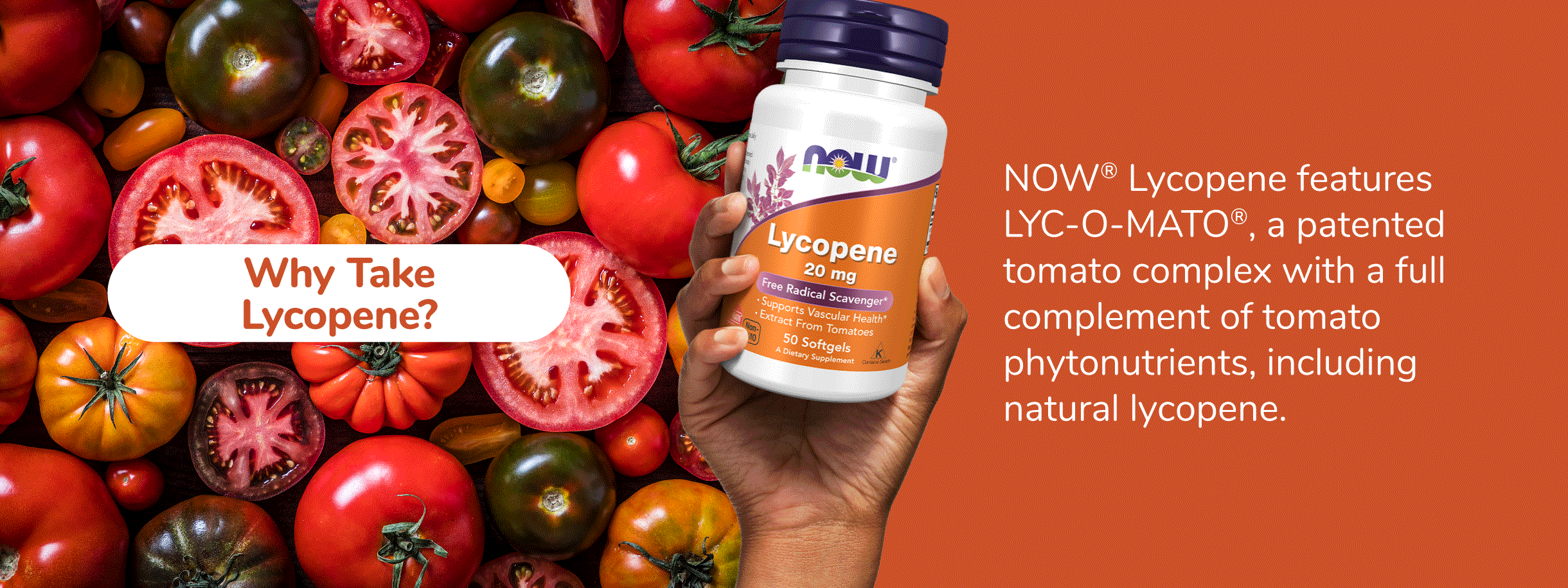 Why Take  Lycopene? NOW® Lycopene features LYC-O-MATO®, a patented tomato complex with a full complement of tomato phytonutrients, including natural lycopene.