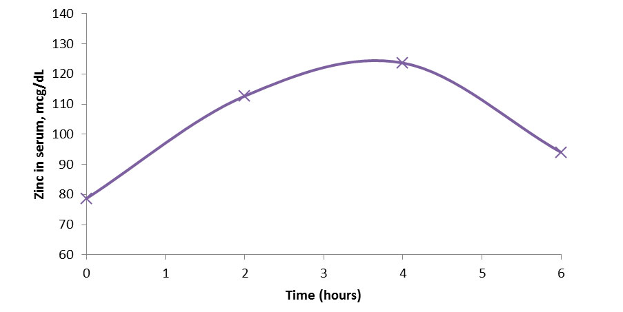 | Time (hours) | Zinc in serum mcg/dL | 0 | 79 | 1 | 92 | 2 | 111 | 3 | 120 | 4 | 122 | 5 | 110 | 6 | 91 |