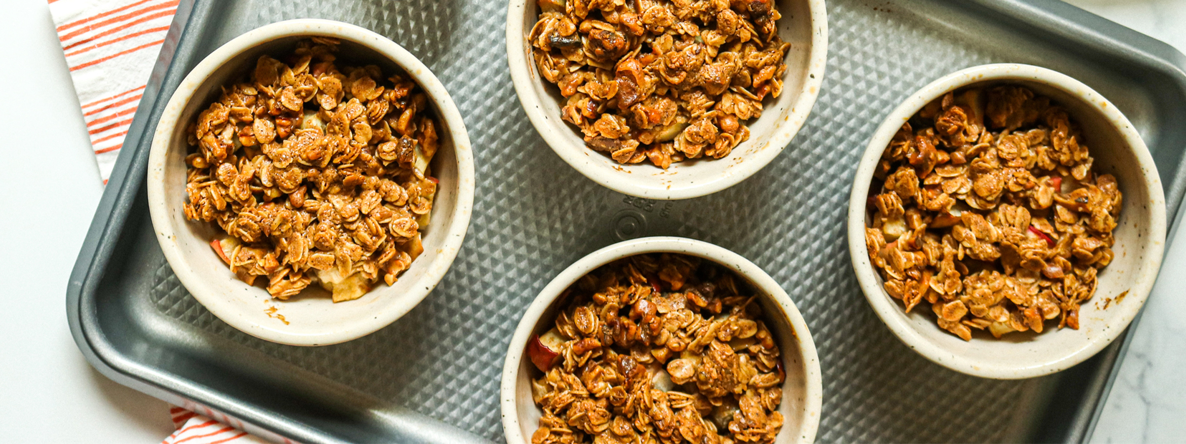 - Divide the crisp topping over the apples. Transfer ramekins to oven and bake for 45 to 50 minutes. Allow to cool for 10 minutes before serving, or cool completely before refrigerating to enjoy later.