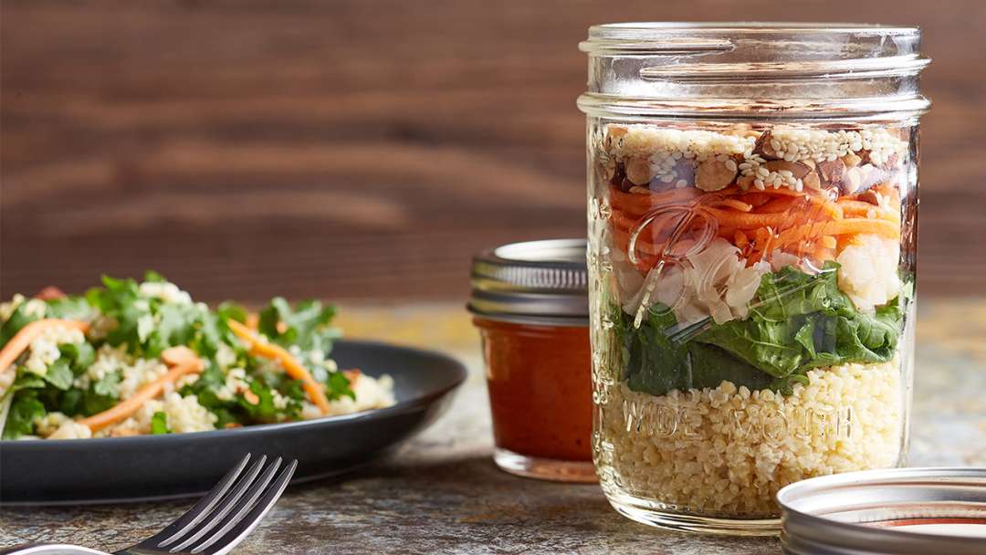 - In a mason jar, layer cooked organic millet, baby kale, carrots, water chestnuts, chopped tamari almonds, and sesame seeds.