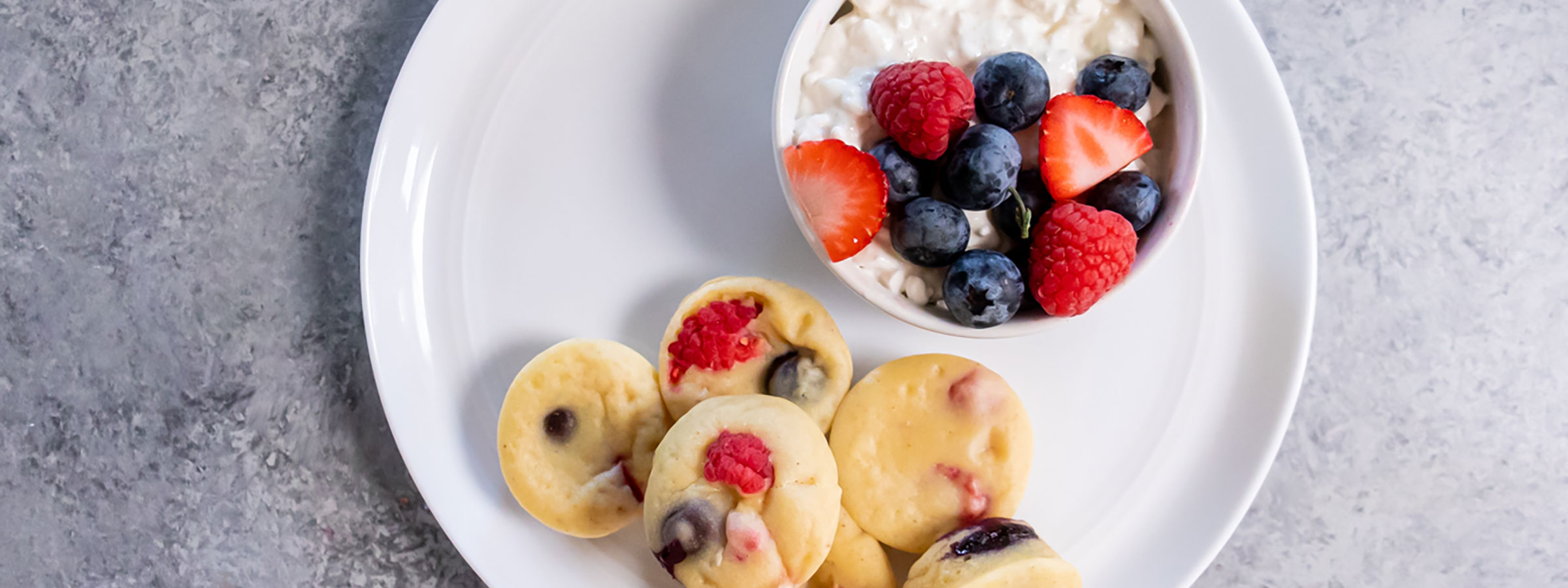 - Gently remove pancake bites and place 6 in large compartments of 4 meal prep containers. Add cottage cheese to small compartments and top with berries.