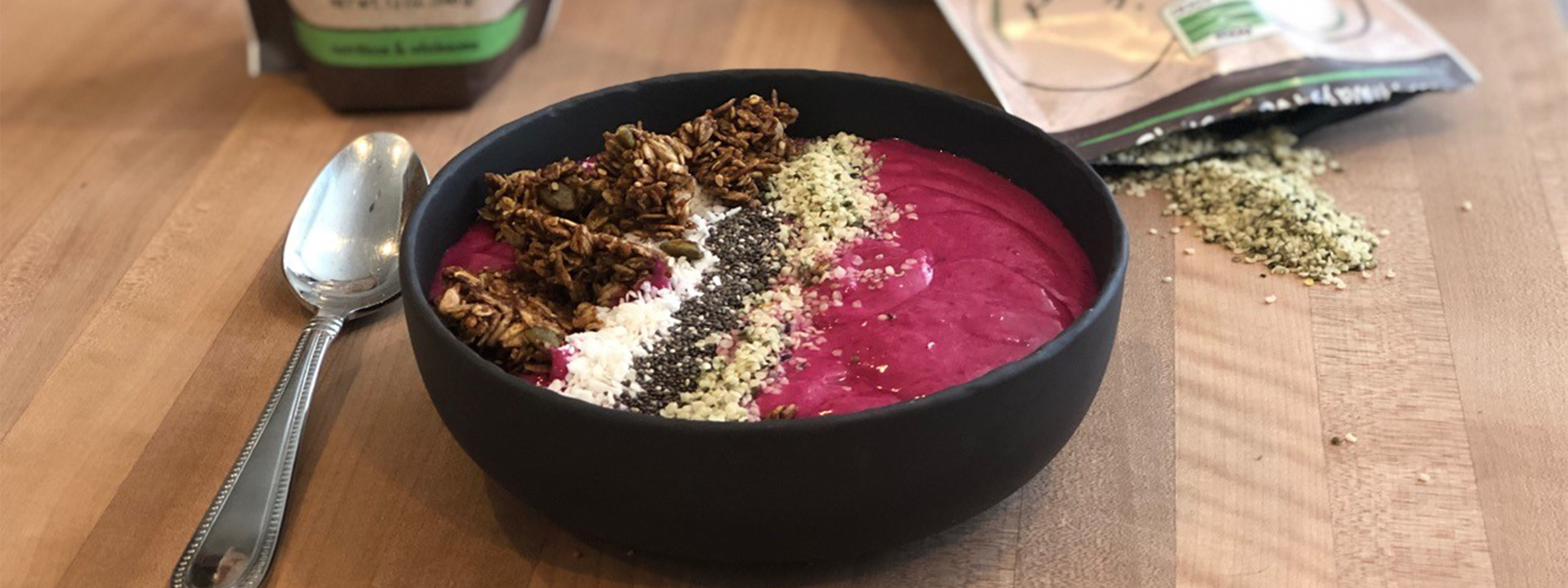 Start your day right with this creamy and satisfying smoothie bowl that sneaks in a serving of mineral-rich beets with your vitamin-C loaded fruits. The cashews and seeds add healthy fat and protein. Double up on the protein by adding a scoop of hemp protein powder. Decorate your bowl with your fave nuts, seeds, and granola to guarantee a happy, not hangry, start to your day.