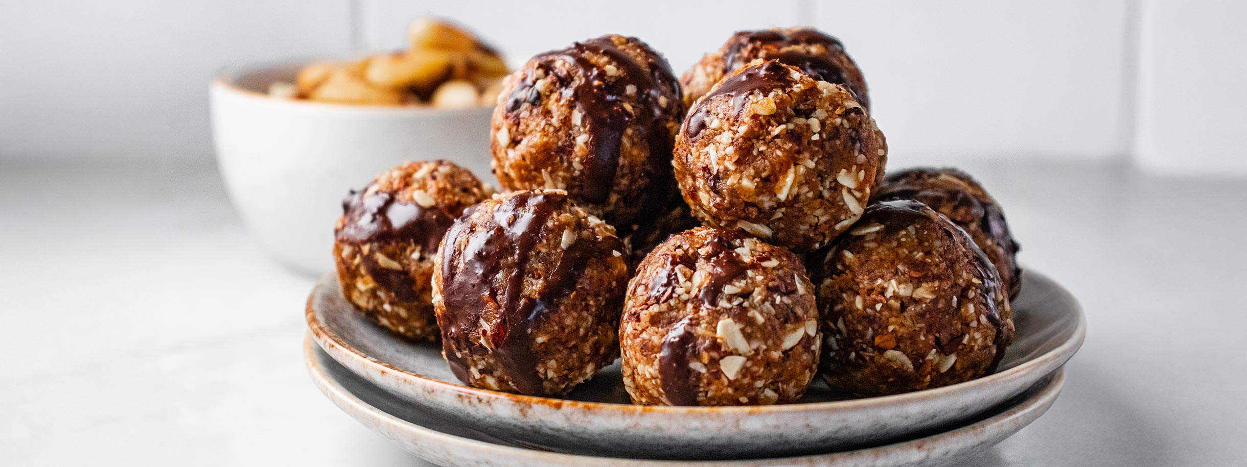 Power through your day with our Brazil and Date Energy Bites, a no-bake snack packed with the natural goodness of NOW Real Food® Brazil Nuts and dates. These energy bites blend nut butter and organic rolled oats for a satisfying crunch, while organic cacao nibs add a hint of chocolate-y flavor. Finished with a rich chocolate drizzle made from organic cacao powder and coconut oil, these bites are a perfect healthy treat to keep you energized and delighted.