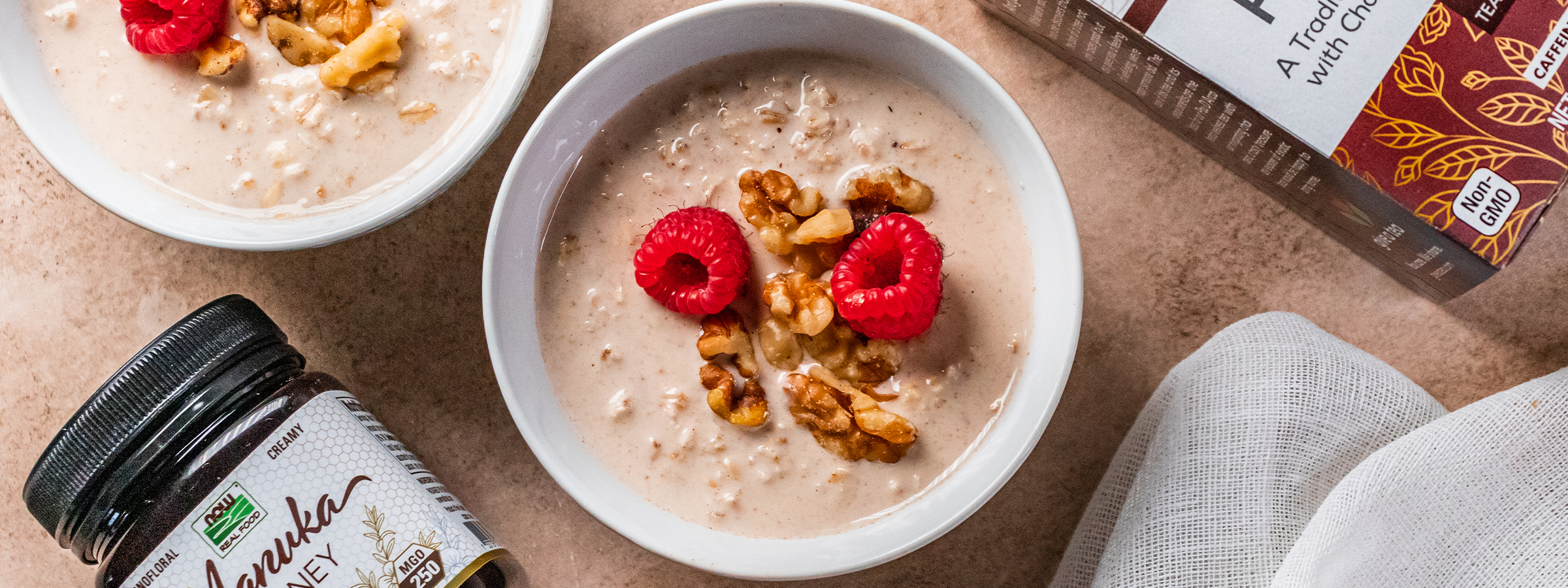Begin your day with the unique fusion of flavors featured in our cozy chia overnight oats. This easy and nutritious breakfast combines the aromatic warmth of Give a Tea™ Pau D’Arco chai tea with the natural sweetness of NOW Real Food® Manuka Honey and organic rolled oats. Simply prepare in minutes, let it rest overnight, and wake up to a delightful, customizable breakfast topped with your choice of nuts, berries, or seeds, perfect for a busy morning or a leisurely brunch.