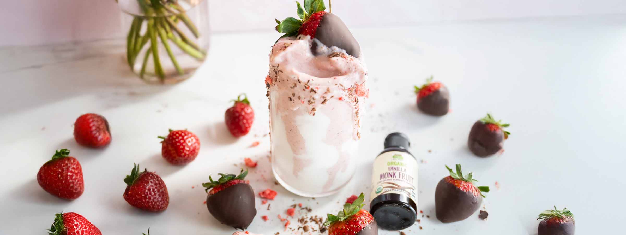 Indulge in a luxurious Chocolate-Dipped Strawberry Vanilla Milkshake, a creamy blend of frozen strawberries and banana, enriched with full-fat coconut cream and oat milk. This decadent treat is sweetened with NOW Real Food® Organic Vanilla Liquid Monk Fruit and garnished with roasted salted macadamia nuts, chocolate shavings, and a chocolate-dipped strawberry for an extra touch of elegance. Perfect as a dessert or a special snack, this milkshake combines the best of smooth, sweet, and fruity flavors into one delightful beverage. Created in partnership with our friends at VegNews.