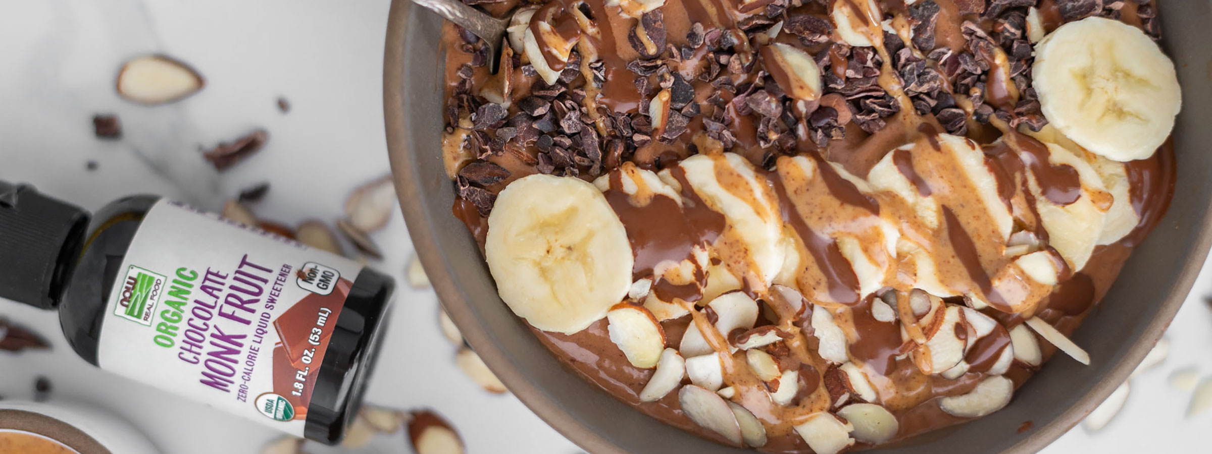 - In a small bowl, combine 5 drops NOW Real Food Chocolate Liquid Monk Fruit, 1 tablespoon cocoa powder, and water until a smooth chocolate sauce forms. Set aside.