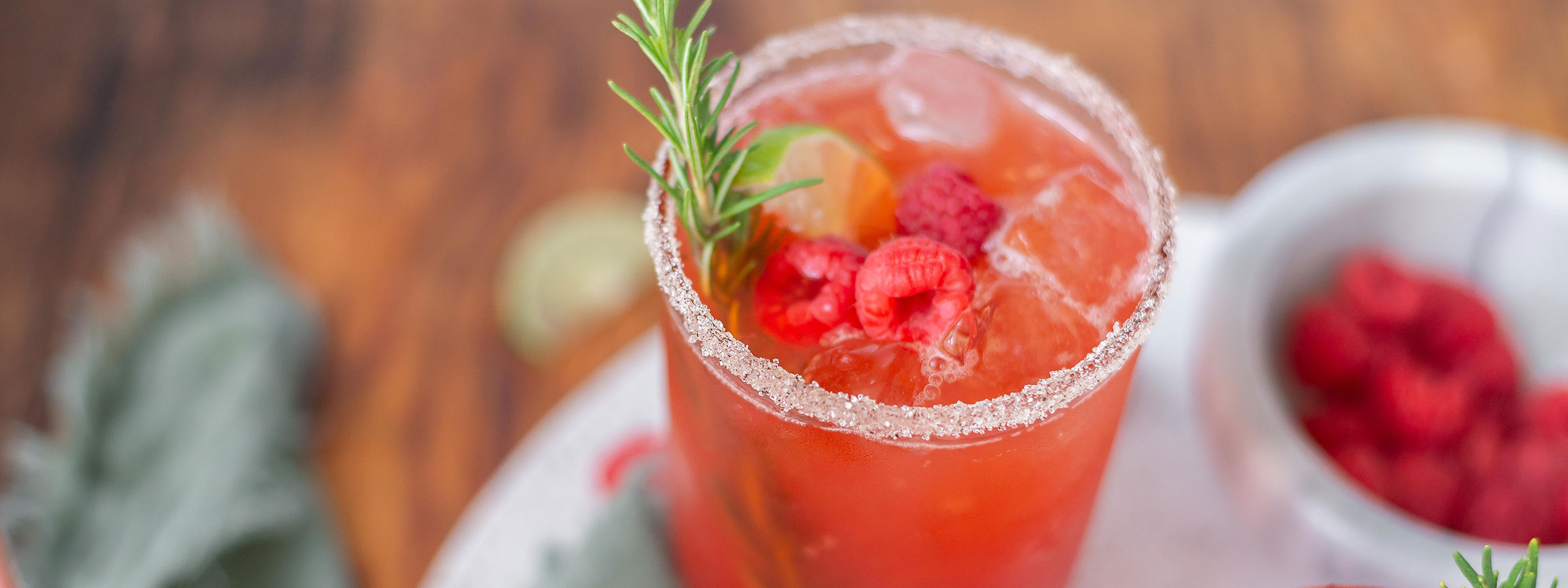 - To serve, create a sugar rim by rubbing glasses with lime wedge and then sugar. Fill two cups with ice, add tea, and garnish with rosemary, raspberries, and lime slices.