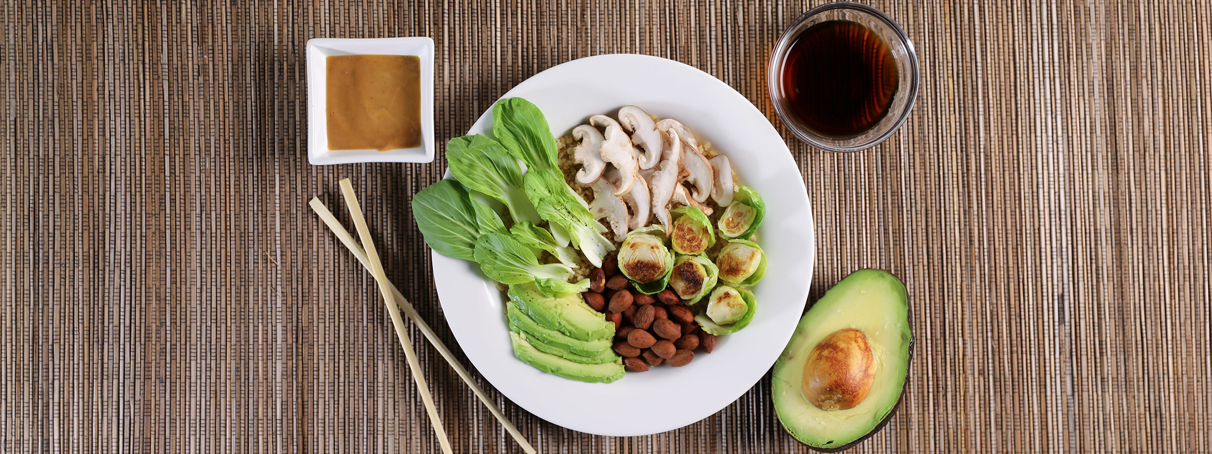 - In a bowl, place peanut-infused quinoa. Add pickled bok choy, grilled Brussels sprouts, sliced avocado, whole enoki mushrooms, and chopped tamari almonds.