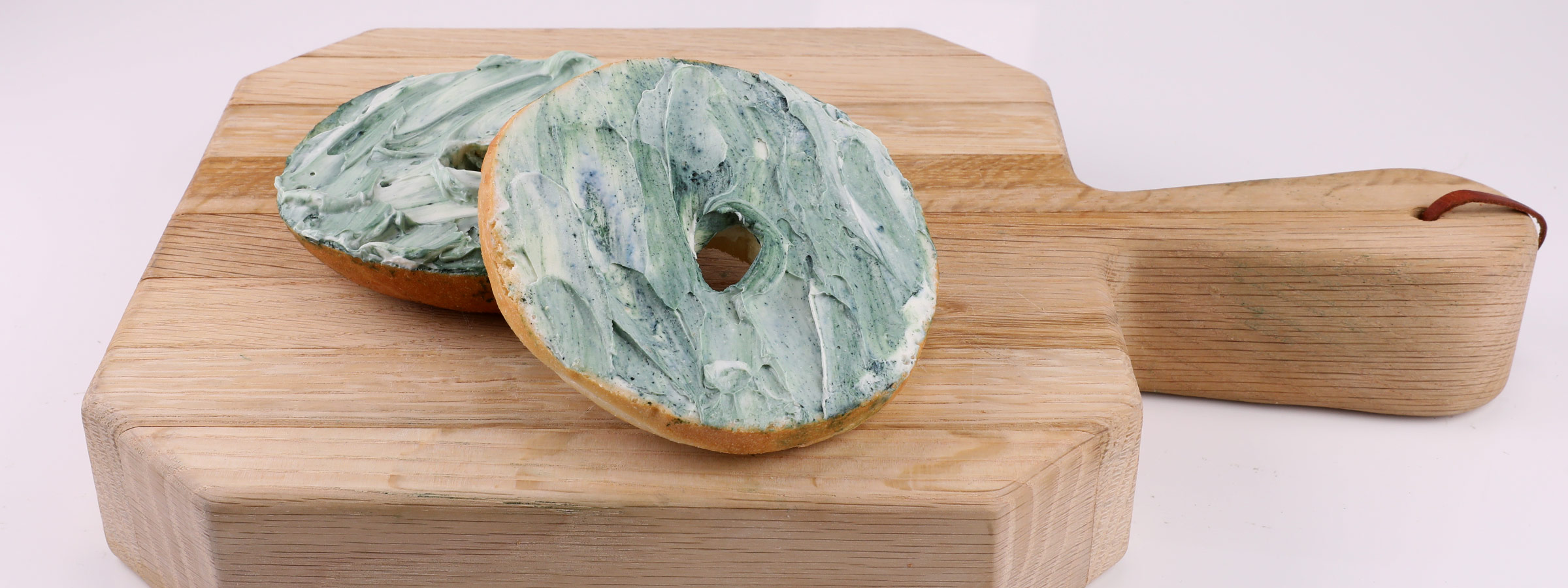 - Spread a light coat of cream cheese on both toasted bagel halves and sprinkle spirulina on top.