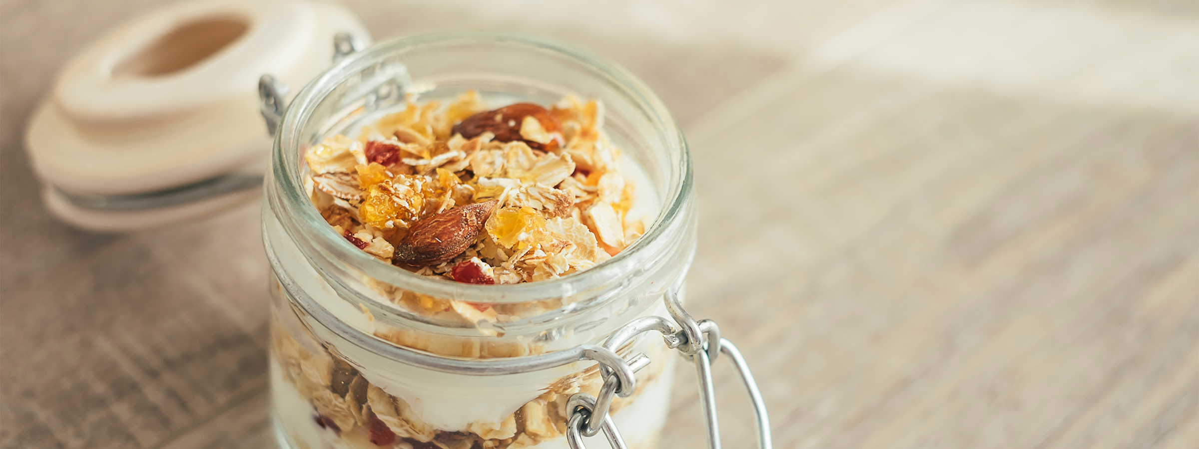 - In a mason jar, place ½ cup of yogurt mixture, then ½ cup of millet granola, then ¼ cup chopped pistachios and ¼ cup chopped apricots. Repeat, and seal the jar.