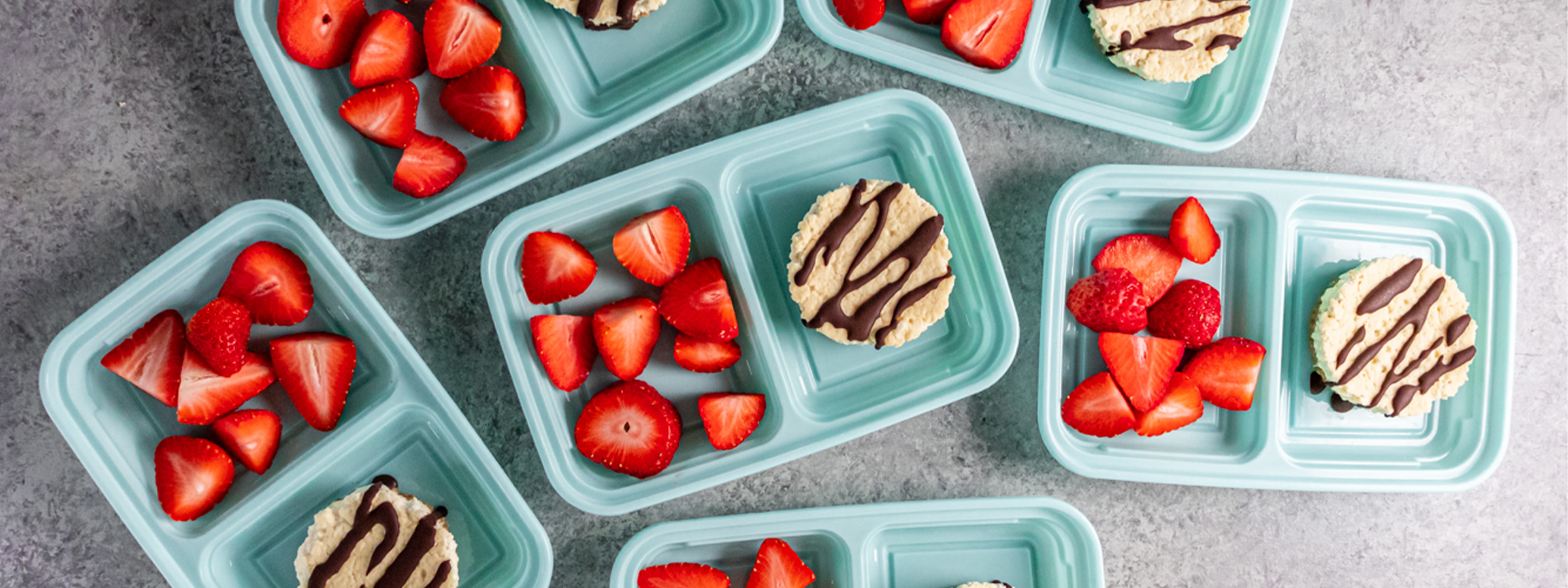 - Divide peanut butter cheesecakes among 6 compartments of meal prep containers. Divide strawberries among remaining compartments. Refrigerate until you're ready to serve.