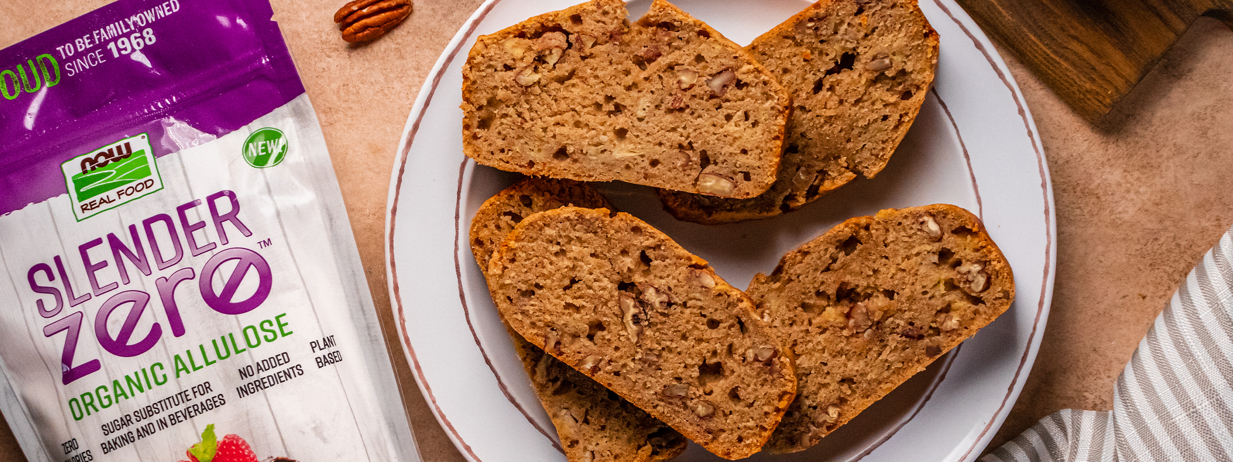 Easy to prepare and irresistibly delicious, this nutty banana bread, with its hint of cinnamon and nutmeg, is a surefire way to satisfy your sweet tooth while keeping healthy eating in mind. Made with ripe bananas, Slender Zero™ Organic Allulose Sweetener, and a generous handful of pecans, this recipe offers a lower calorie twist on the traditional banana bread (thanks to allulose, a sugar alternative), an ideal for a wholesome breakfast or a cozy afternoon snack.