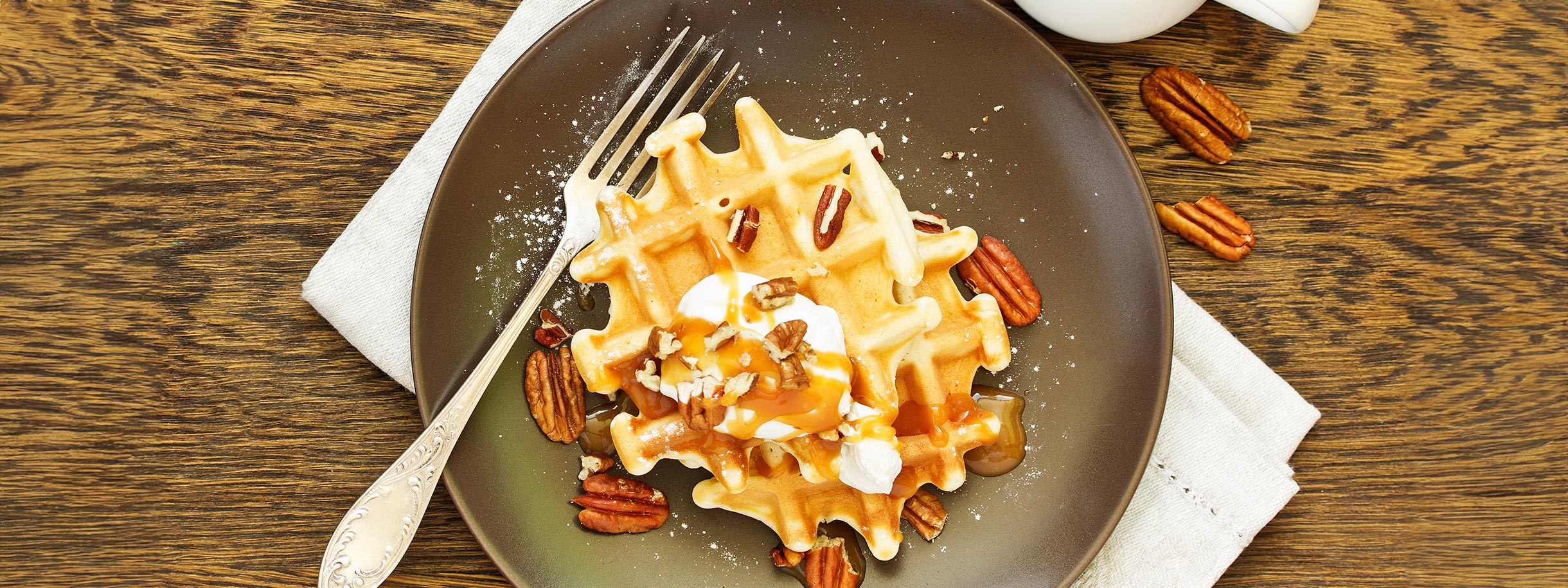 To serve, spread waffles with ghee and sprinkle with pecans.