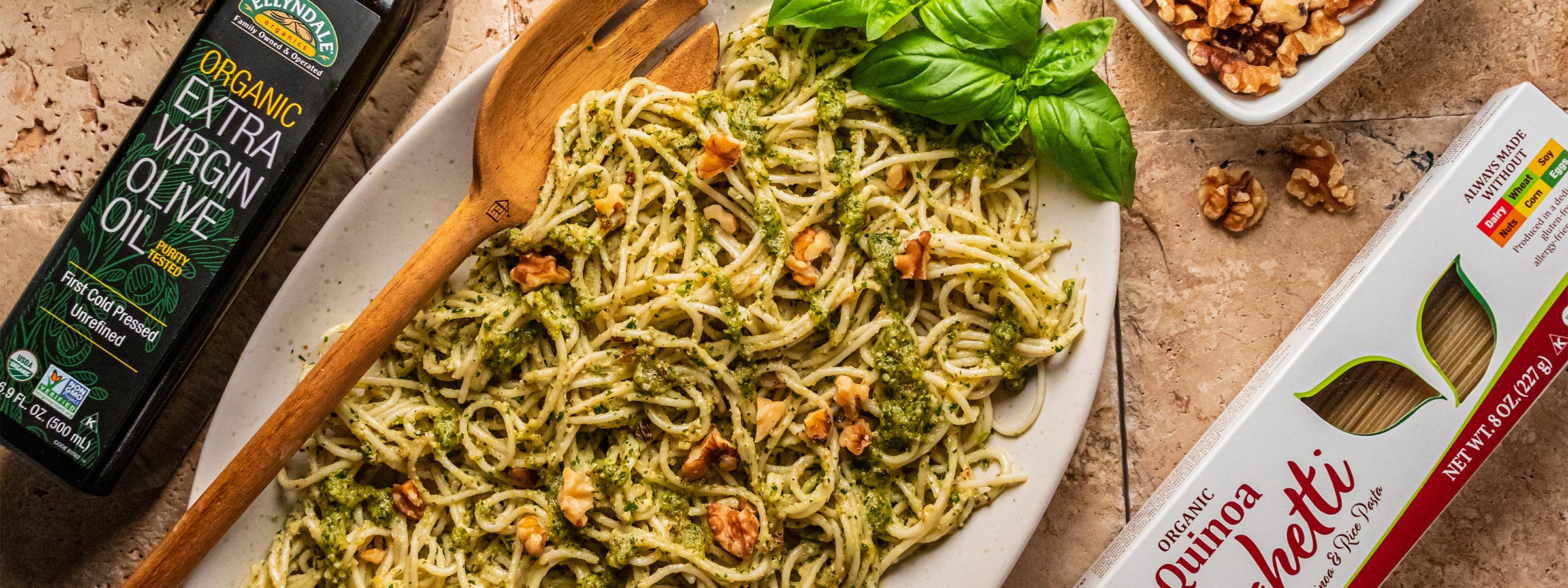 Whip up a quick and healthy meal with our Quinoa Spaghetti with Walnut Pesto recipe, a delightful twist on a classic Italian dish. This hearty recipe features Living Now® Organic Quinoa Spaghetti tossed in a homemade pesto sauce, richly flavored with NOW Real Food® Raw Unsalted Walnuts, fresh basil, parsley, and Ellyndale® Organic Extra Virgin Olive Oil. Perfect for a nourishing entrée or side, this vegan-friendly spaghetti dish is packed with plant-based protein and vibrant herbs, ready to impress in just 25 minutes.