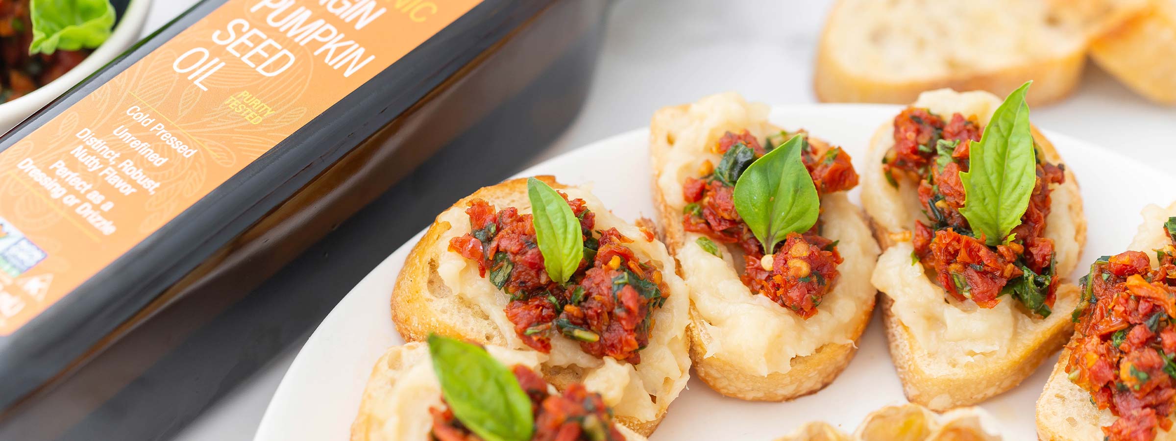 Crostini is always a fan favorite appetizer. Give the traditional recipe a spin with fresh garlic, sundried tomatoes, basil, and pumpkin seed oil. Each bite is a taste bud delight. Drizzle a little pumpkin seed oil over the assembled crostini for an extra nourishing treat.