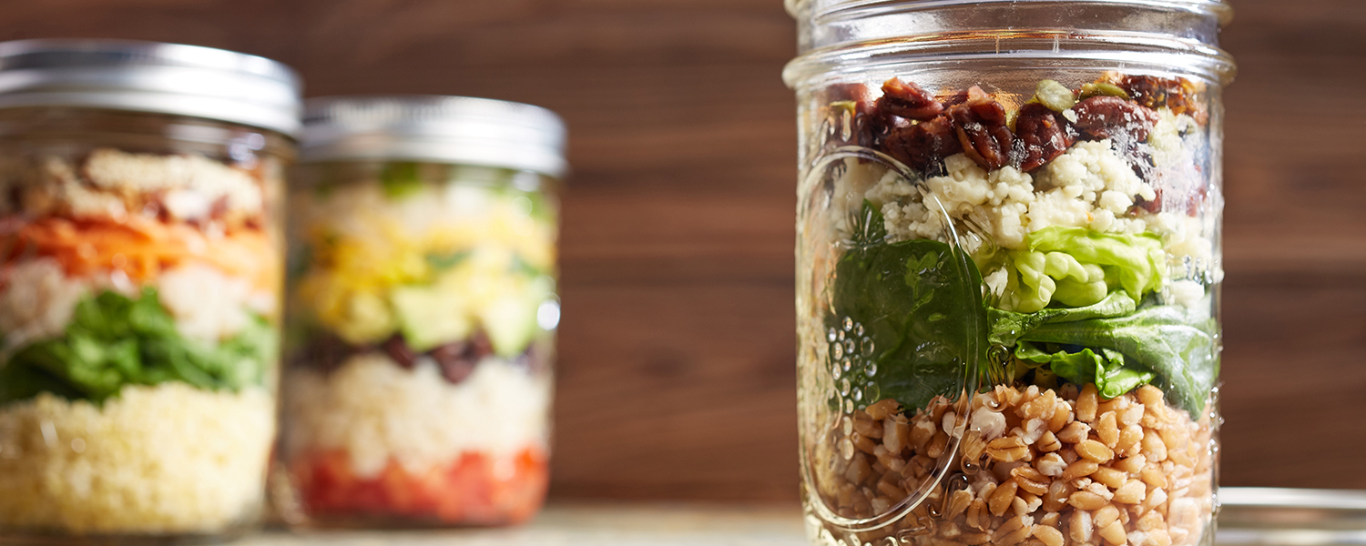 - In a mason jar, layer cooked organic farro, mixed greens, honey roasted pecans, organic pumpkin seeds, blue cheese, and organic goldenberries.