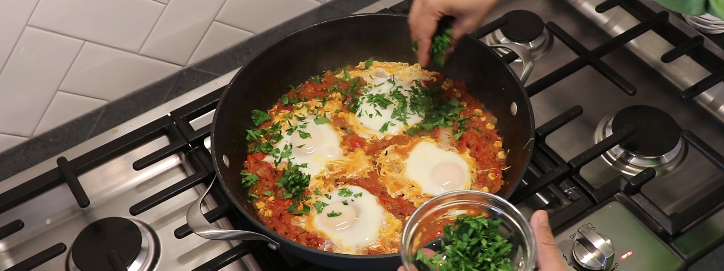 - Crack four eggs 1-inch apart into the pan on low heat, cover, and cook for five minutes.