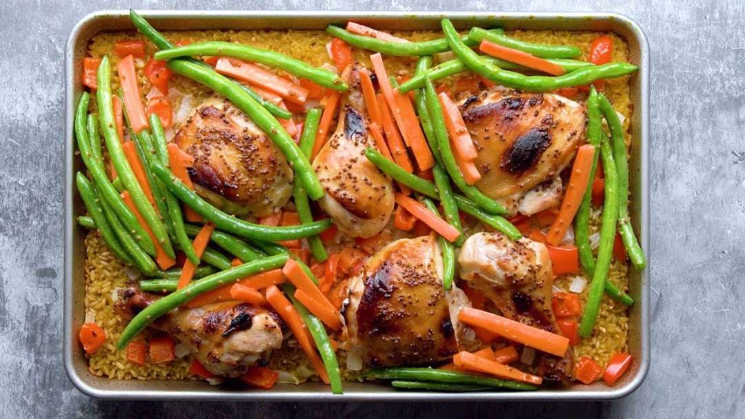 - In a bowl, combine the remaining honey mustard mixture on the carrots and string beans. Toss to coat and add to the tray of chicken and rice and bake for 15 minutes.
