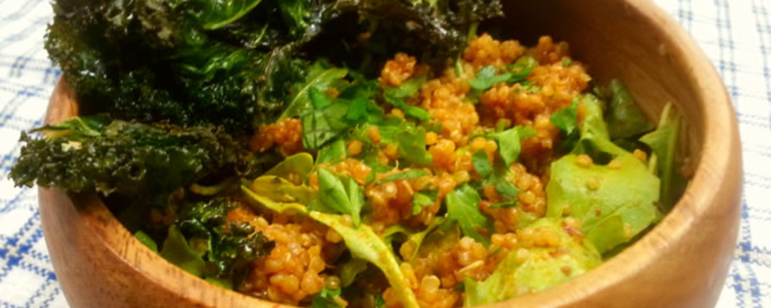 Tonight we’re creating a tasty Thai red curry with a variety of fresh and flavorful ingredients using cumin, coriander, white pepper, galangal, Thai chili and more. Then we’re combining it with quinoa, arugula and cilantro, and topping it with lightly crisped kale, to create a salad that pops with flavor, color and fragrance. Everything about this incredible salad appeals to the senses!