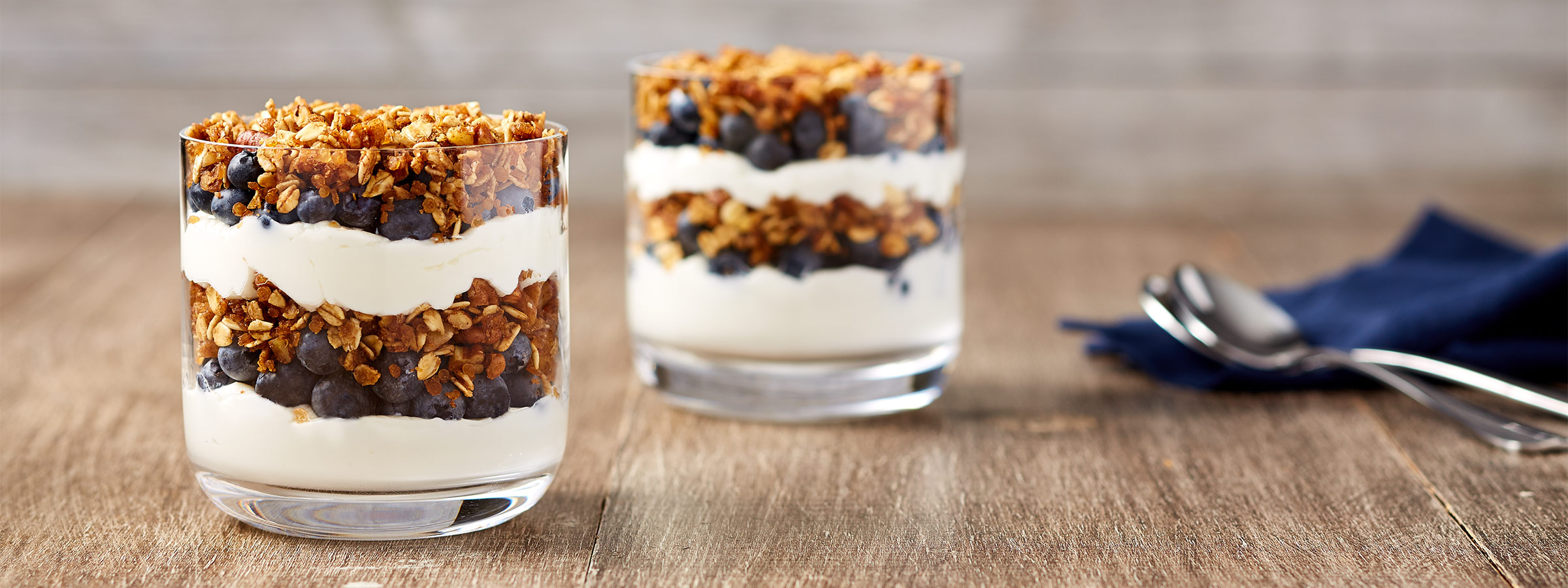 Two short glasses on a wooden table hold Toasted Manuka Honey Cinnamon Granola Parfaits