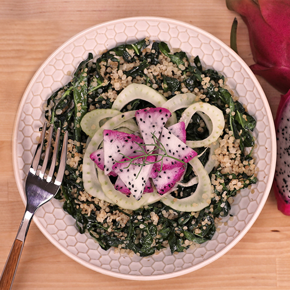 - Combine Romaine hearts, apple, celery, tri-color quinoa, walnuts, and Concord grapes in a bowl.