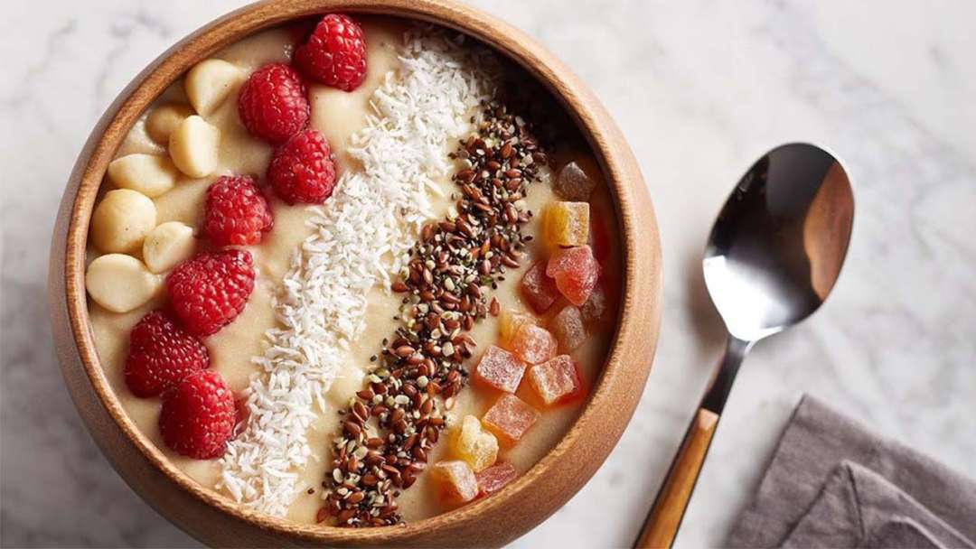- Place in chilled bowl and top with organic triple omega mix, shredded coconut, dried fruit dice, and salted macadamia nuts.