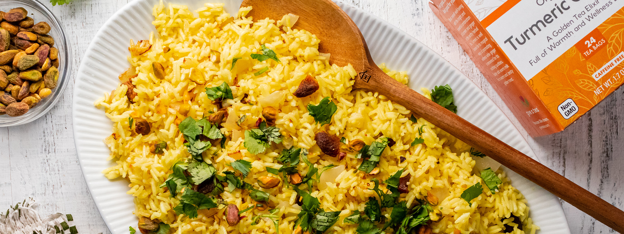 Spice up your weeknight dinners with our Turmeric Ginger Moroccan Rice recipe, a vibrant and healthful dish that's as delightful to eat as it is easy to prepare. Steeped with Give a Tea™ Organic Turmeric Ginger tea, this recipe not only imparts a rich, aromatic flavor but also harnesses the wellness benefits of turmeric and ginger. The exotic dish is further enhanced with the sweetness of NOW Real Food® Organic Unsweetened Apricots and the crunch of NOW Real Food® Roasted Salted Pistachios, making it a perfect vegan friendly entrée or side dish that's sure to be a hit at any table.