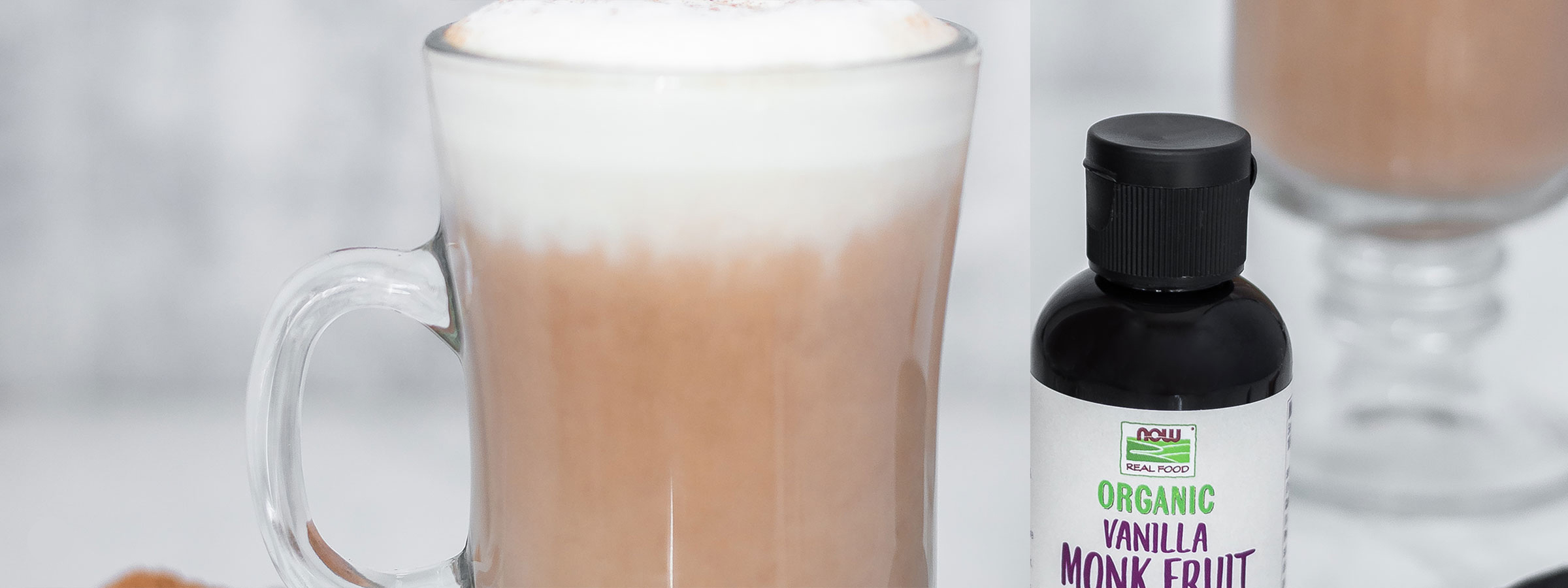 - In a pot over medium heat, combine 2⅓ cups oat milk, espresso, cocoa powder, cinnamon, and NOW Real Food Vanilla Liquid Monk Fruit. Whisk constantly for 2 minutes, until combined and hot.