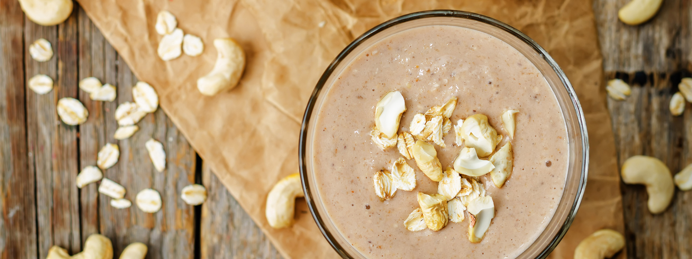 - Pour almond milk into a blender then add banana, protein powder, collagen peptides, cashew butter and MCT oil.