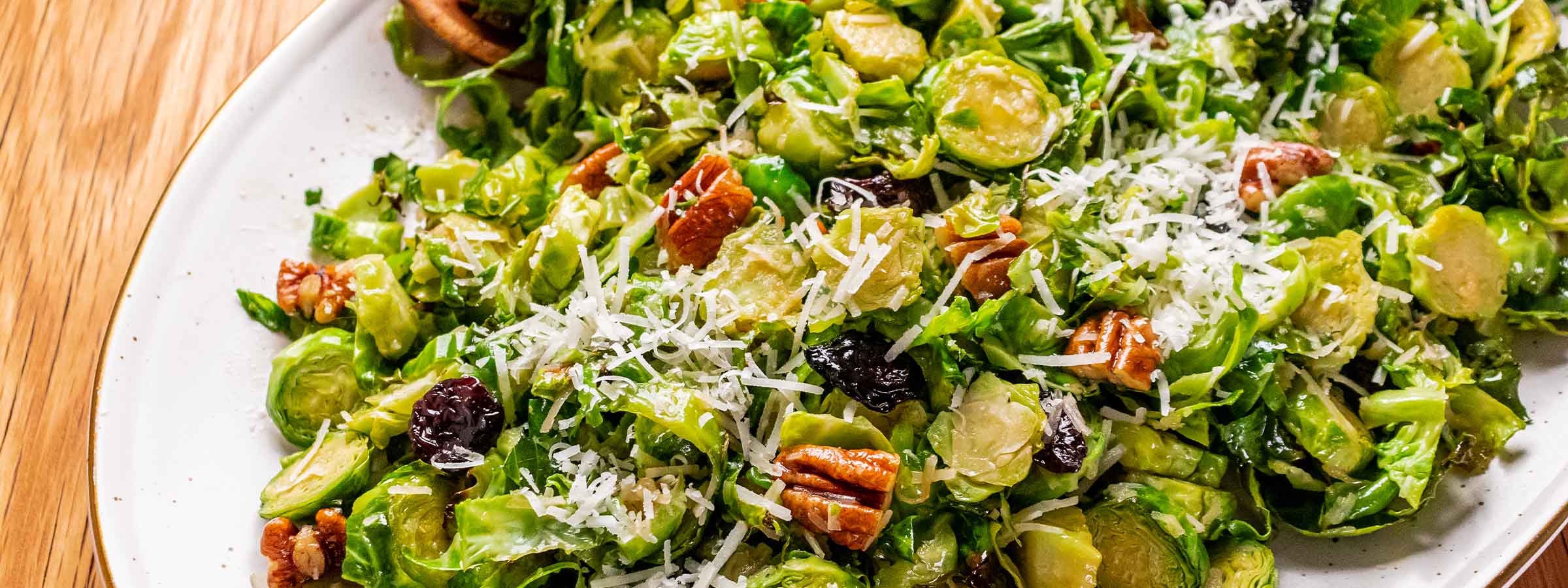 Transfer brussels sprouts to a mixing bowl and add cherries, pecans, and Parmesan cheese. Drizzle with dressing and stir to coat.