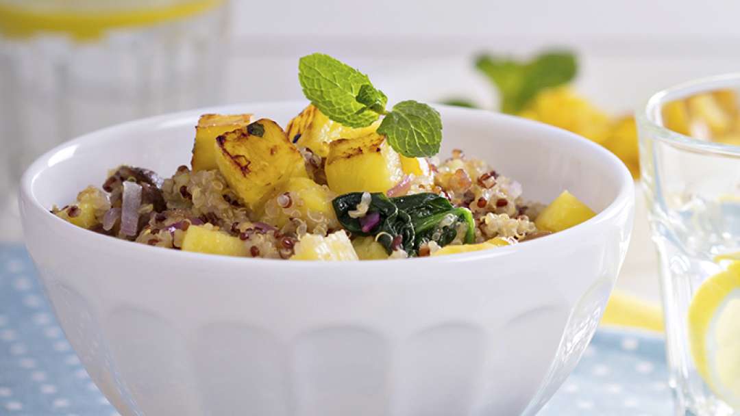 This truly comforting seasonal salad is a combination of quinoa, butternut squash and walnuts that’s brought to life with a mouth-watering dressing that includes vanilla extract, cinnamon, maple syrup, olive oil, cranberry juice and lemon juice.