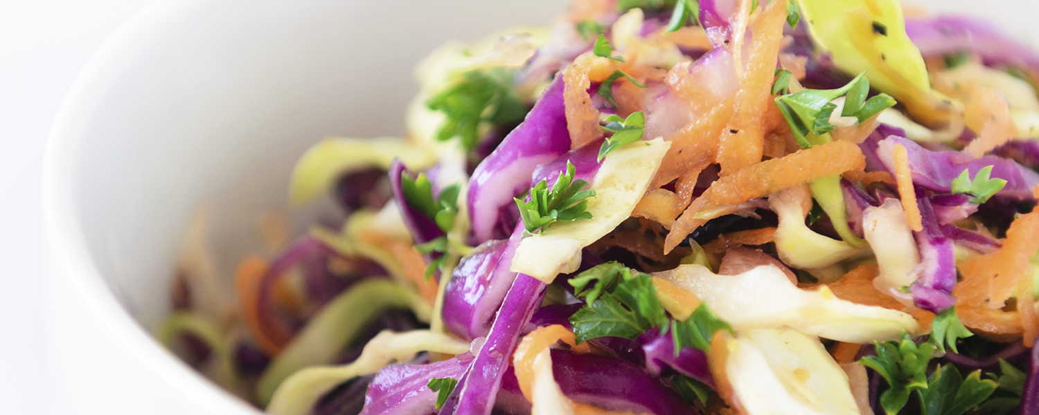 Nature’s colorful array of fruits and vegetables is on full display with this Zesty Lime Slaw, an explosion of flavor that includes green and red cabbage, green onions, cilantro, carrots, lime, Greek yogurt, and more. This dish is great as a side salad, and makes a unique topping for sandwiches.