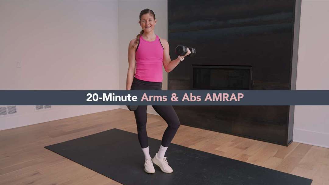 - Complete 10 reps of each exercise and repeat AMRAP (as many rounds as possible) in 10 minutes. At the end of 10 minutes, you can rest for 1 minute or hold a 1-minute plank. Then repeat this same format for another 10 minutes for a 20-minute arms + abs workout!