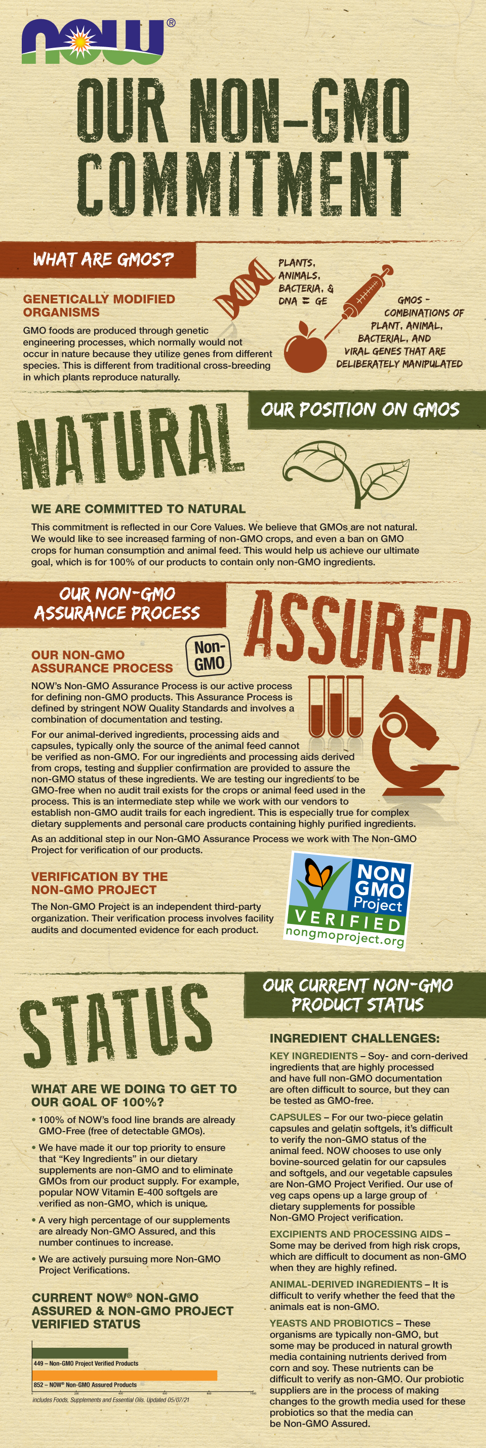 This Non-GMO Assurance Process Icon that you will find on our product labels and on online product pages is backed by stringent NOW Quality Standards and involves a combination of documentation and testing. For our animal-derived ingredients, processing aids and capsules, typically only the source of the animal feed cannot be verified as non-GMO. For our ingredients and processing aids derived from crops, testing and supplier confirmation are provided to assure the non-GMO status of these ingredients. We are testing our ingredients to be GMO-free when no audit trail exists for the crops or animal feed used in the process. This is an intermediate step while we work with our vendors to establish non-GMO audit trails for each ingredient. This is especially true for complex dietary supplements and personal care products containing highly purified ingredients. As an additional step in our Non-GMO Assurance Process, we work with The Non-GMO Project for verification of our products.