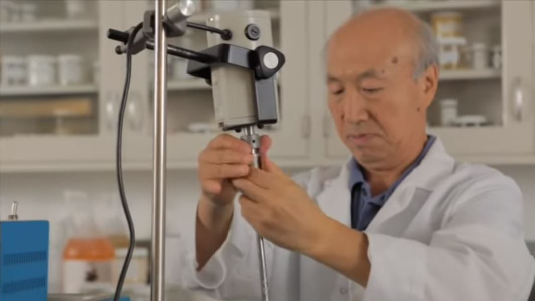 medium skin female presenting person wearing white lab coat and blue rubber gloves working on machine in lab