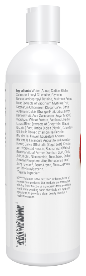 Ingredients: Water (Aqua), Sodium Olefin Sulfonate, Lauryl Glucoside, Glycerin, Babassuamidopropyl Betaine, Multifruit Extract Blend [extracts of Vaccinium Myrtillus Fruit, Saccharum Officinarum (Sugar Cane), Citrus Aurantium Dulcis (Orange) Fruit, Citrus Limon (Lemon) Fruit, Acer Saccharum (Sugar Maple)], Hydrolyzed Wheat Protein, Panthenol, Herbal Extract Blend [extracts of Glycyrrhiza Glabra (Licorice) Root, Urtica Dioica (Nettle), Calendula Officinalis Flower, Chamomilla Recutita (Matricaria) Flower, Equisetum Arvense (Horsetail), Lavandula Angustifolia (Lavender) Flower, Salvia Officinalis (Sage) Leaf], Keratin and Hydrolyzed Keratin, Rosmarinus Officinalis (Rosemary) Leaf Extract, Xanthan Gum, Citric Acid, Biotin, Niacinamide, Tocopherol, Sodium Ascorbyl Phosphate, Aloe Barbadensis Leaf Juice Powder*, Berry Aroma, Phenoxyethanol and Ethylhexylglycerin. *Organic ingredient