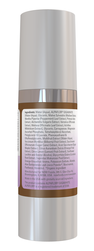 Ingredients: Water (Aqua), ALPAFLOR® GIGAWHITE [Water (Aqua), Glycerin, Malva Sylvestris (Mallow) Extract, Mentha Piperita (Peppermint) Leaf Extract, Primula Veris Extract, Alchemilla Vulgaris Extract, Veronica Officinalis Extract, Melissa Officinalis Leaf Extract, Achillea Millefolium Extract], Glycerin, Carrageenan, Magnesium Ascorbyl Phosphate, Tetrahexyldecyl Ascorbate (Vitamin C), Polyglyceryl-10 Laurate, Multifruit Extract [Water (Aqua), Vaccinium Myrtillus (Bilberry) Fruit Extract, Saccharum Officinarum (Sugar Cane) Extract, Acer Saccharum (Sugar Maple) Extract, Citrus Aurantium Dulcis (Orange) Fruit Extract, Citrus Limon (Lemon) Fruit Extract], Sunflower Lecithin and Benzyl Alcohol, Glycyrrhiza Glabra (Licorice) Root Extract, Sapindus Mukurossi Peel Extract, Panthenol, Phenoxyethanol and Ethylhexylglycerin, Aloe Barbadensis Leaf Juice Powder*, Allantoin, Niacinamide, Hinokitiol, Fragrance, Potassium Sorbate. *Organic ingredient